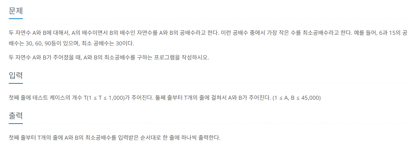문제 자체는 명확하고 간단하다. 테스트 케이스 각각의 두 수(A, B)의 최소 공배수를 출력해주면 된다.
