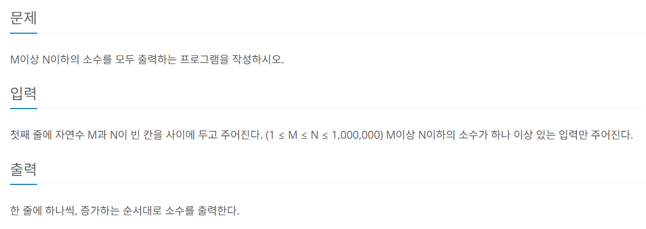 이번 문제는 입력받은 M과 N 사이의 모든 소수들을 출력해주면 되는 아주 단순한 문제이다.