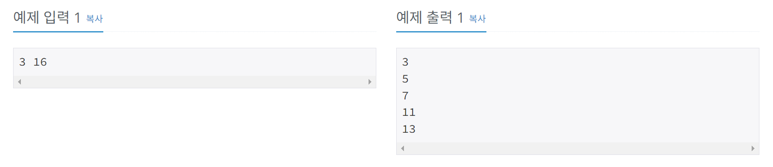첫째 줄에 자연수 M과 N이 빈 칸을 사이에 두고 주어진다. (1 ≤ M ≤ N ≤ 1,000,000) M이상 N이하의 소수가 하나 이상 있는 입력만 주어진다.