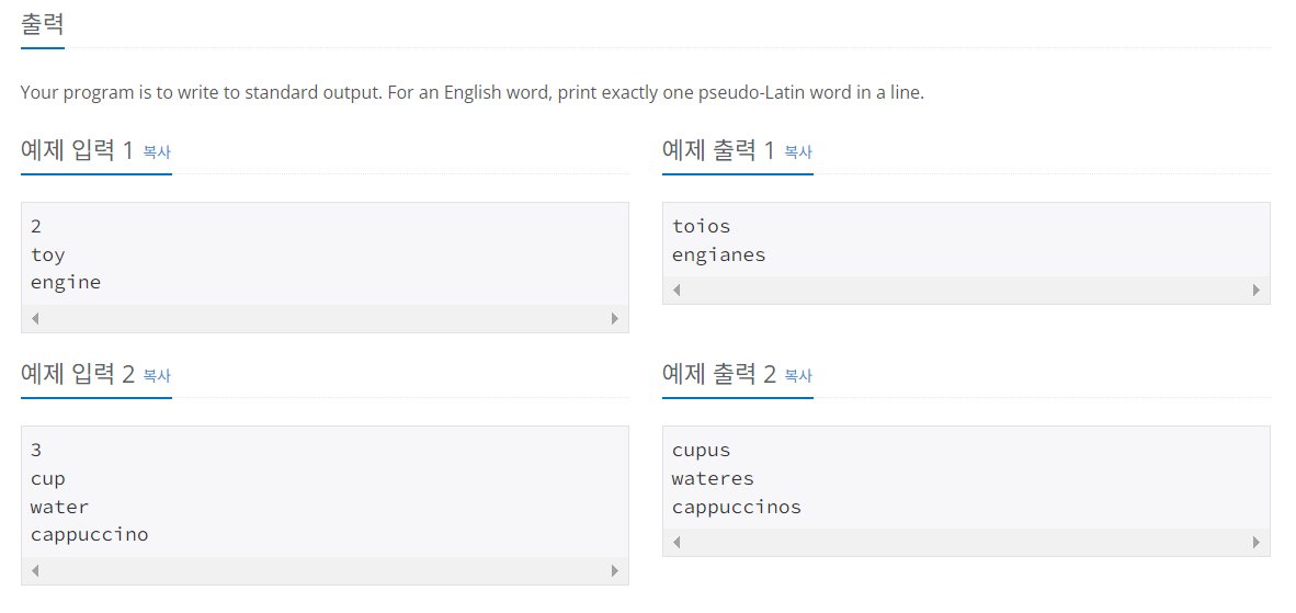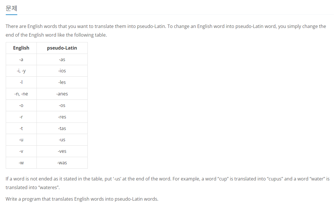 문제는 입력받은 문자열을 표를 참고해서 마지막이 English열에 해당하는 문자들 (-a, .. , -w) 로 끝나는 문자들은 매칭 되는 pseudo-Latin열의 문자들로 치환해주면 되는 간단한 문제이다.