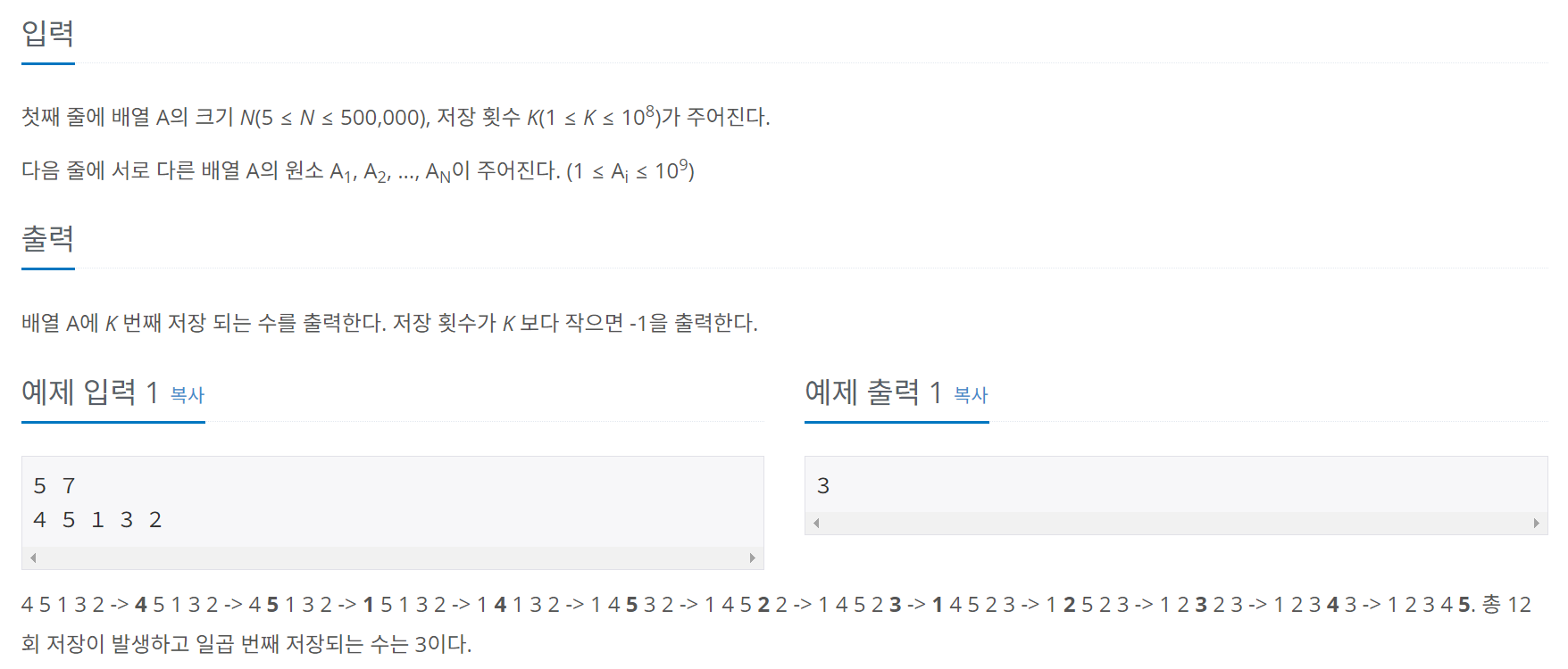 그리고 병합 정렬이 끝났는데도 K가 0보다 클 경우에는 -1을 출력해주면 되겠다.