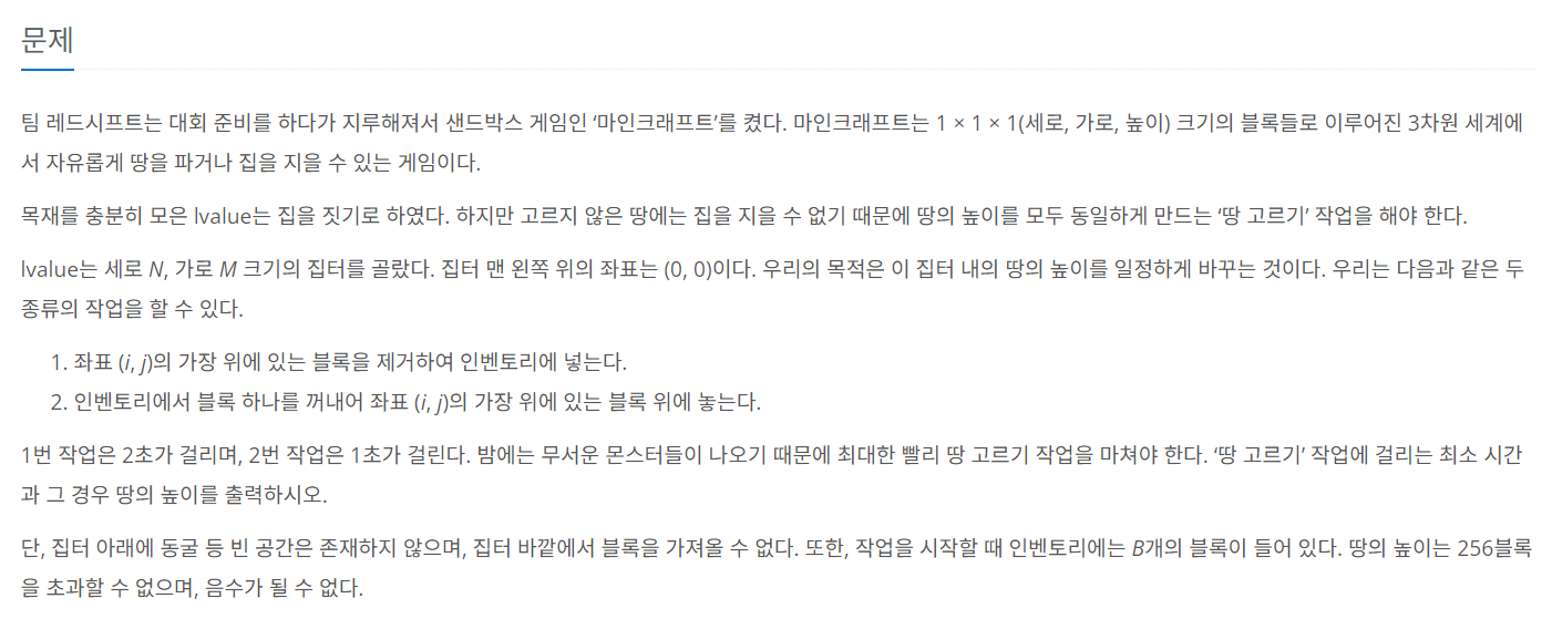 이를 잘 생각해보면 최소한의 작업 시간으로 땅을 평탄화를 시켰을 때 나올 땅의 높이를 구하면 된다는 것을 알 수 있다.