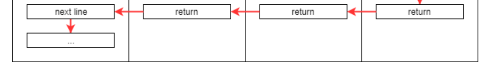 위 함수의 호출과 반환에서 말했듯이 함수 C의 정의된 로직들이 실행된 뒤 값을 반환하면, 시점은 함수 B에서 함수 C를 호출한 부분으로 넘어간다. 즉, 함수 C를 호출한 라인 이후의 나머지 코드들이 마저 실행된다는 뜻이다.