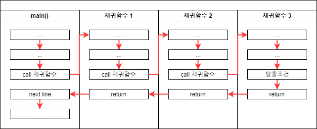처음 살펴본 "함수의 호출과 반환에서의 데이터 흐름"과 "재귀 함수가 호출한 자신들이 서로 독립된 함수들" 이란 사실을 인지하면 재귀 함수가 아래 그림과 같이 동작함을 알 수 있다.