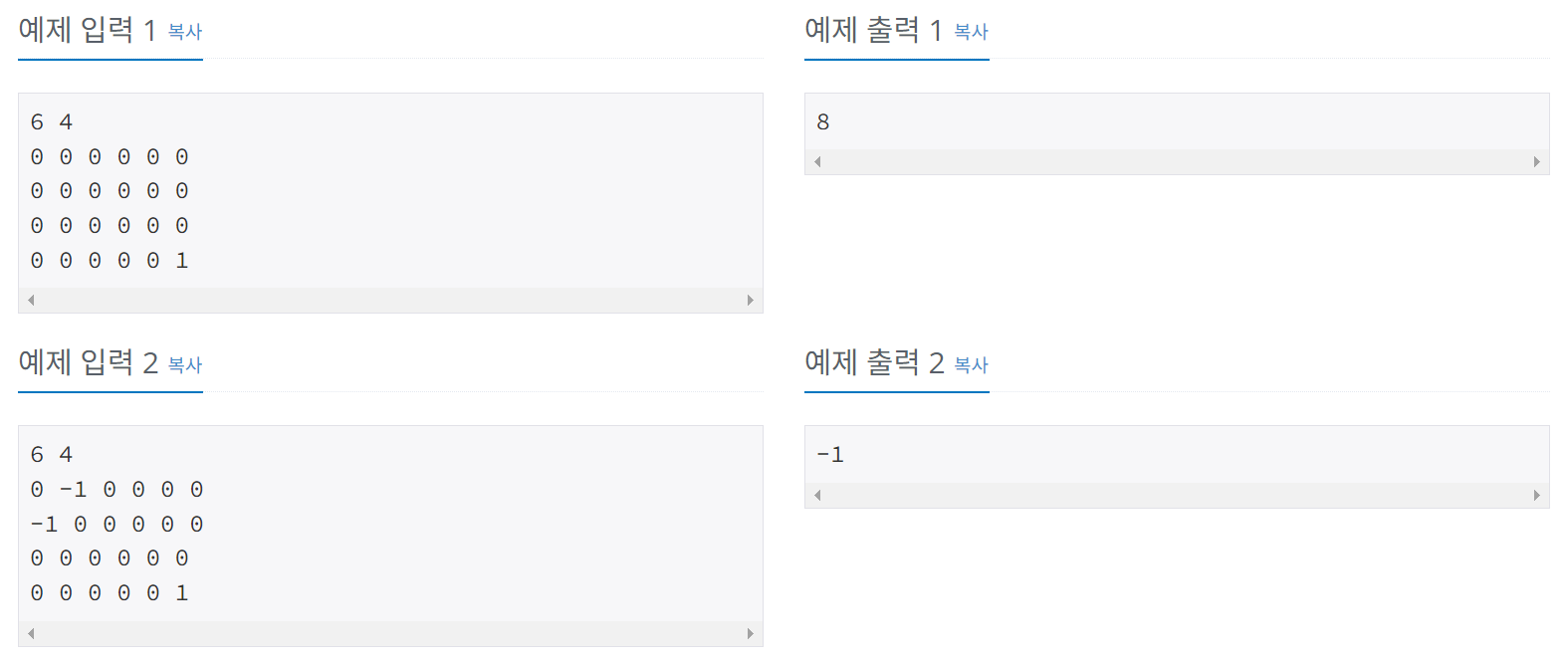 //토마토 (2차원) const fs = require('fs'); let [[M, N], ...box] = fs .readFileSync('../input.txt') .toString() .trim() .split('\n') .map((row) => row.split(' ').map(Number)); const directions = [ [1, 0], [-1, 0], [0, 1], [0, -1], ]; let queue = [], nextQueue; let days = 0; // 초기 익은 토마토 위치 찾기 box.forEach((row, i) => row.forEach((tomato, j) => { if (tomato === 1) queue.push([i, j]); }) ); // BFS 실행 while (queue.length > 0) { nextQueue = []; queue.forEach(([x, y]) => { directions.forEach(([dx, dy]) => { const nx = x + dx, ny = y + dy; if (nx >= 0 && nx < N && ny >= 0 && ny < M && box[nx][ny] === 0) { box[nx][ny] = 1; nextQueue.push([nx, ny]); } }); }); queue = nextQueue; if (queue.length > 0) days++; } // 모든 토마토가 익었는지 확인 const isAllRipe = box.every((row) => row.every((tomato) => tomato !== 0)); console.log(isAllRipe ? days : -1);