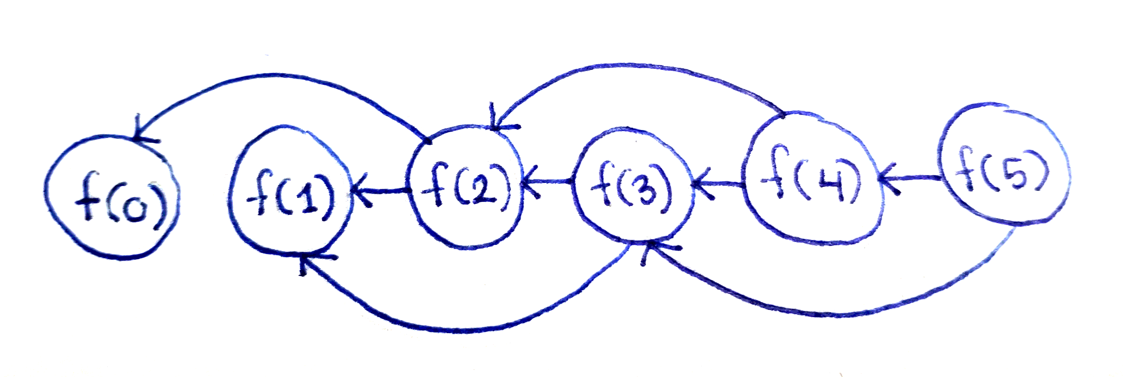 f(n)이 참조하는 값이 f(n-1)과 f(n-2)이기 때문에 위 그림에서 화살표가 왼쪽으로 향하듯이 표현되어 있지만, 실제로는 반복문을 통해 n값이 1씩 증가하고 있기 때문에 테이블에 값이 저장되는 순서는 f(2) -> f(3) -> f(4) -> f(5)로 진행되고 있습니다.