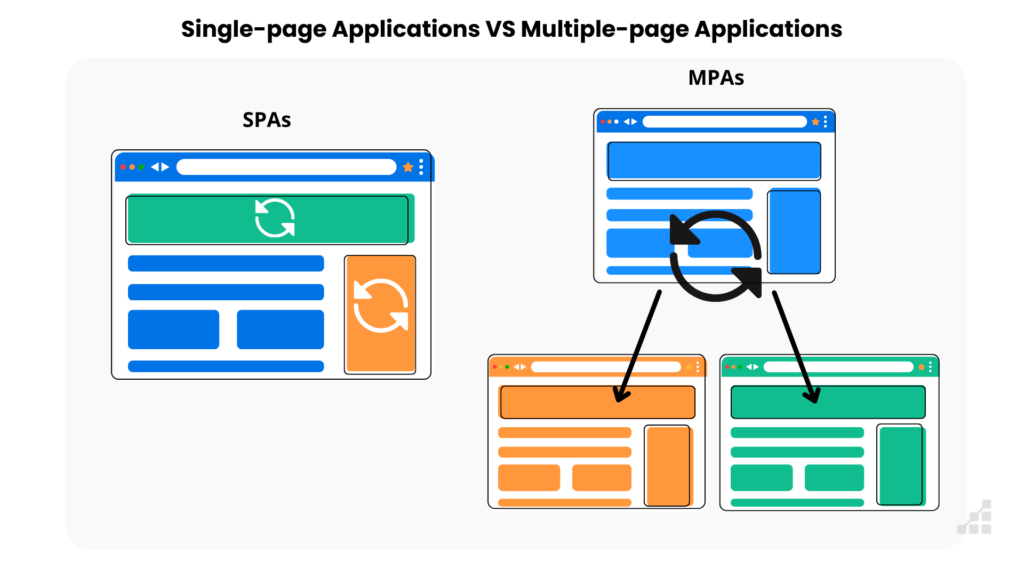 기존의 다중 페이지 애플리케이션(MPA)에서는 사용자가 다른 페이지로 이동할 때마다 서버로부터 새로운 HTML 페이지를 받아오고 전체 페이지를 새로 고칩니다. 반면에 SPA에서는 처음에 한 번만 전체 페이지를 로드하고, 이후의 페이지 전환은 서버와 비동기적 통신(AJAX)을 통해 필요한 데이터만 받아와 화면을 동적으로 갱신합니다. 이를 통해 페이지 이동 시 발생하는 로딩 시간을 최소화하고, 부드러운 UX를 사용자에게 제공합니다.